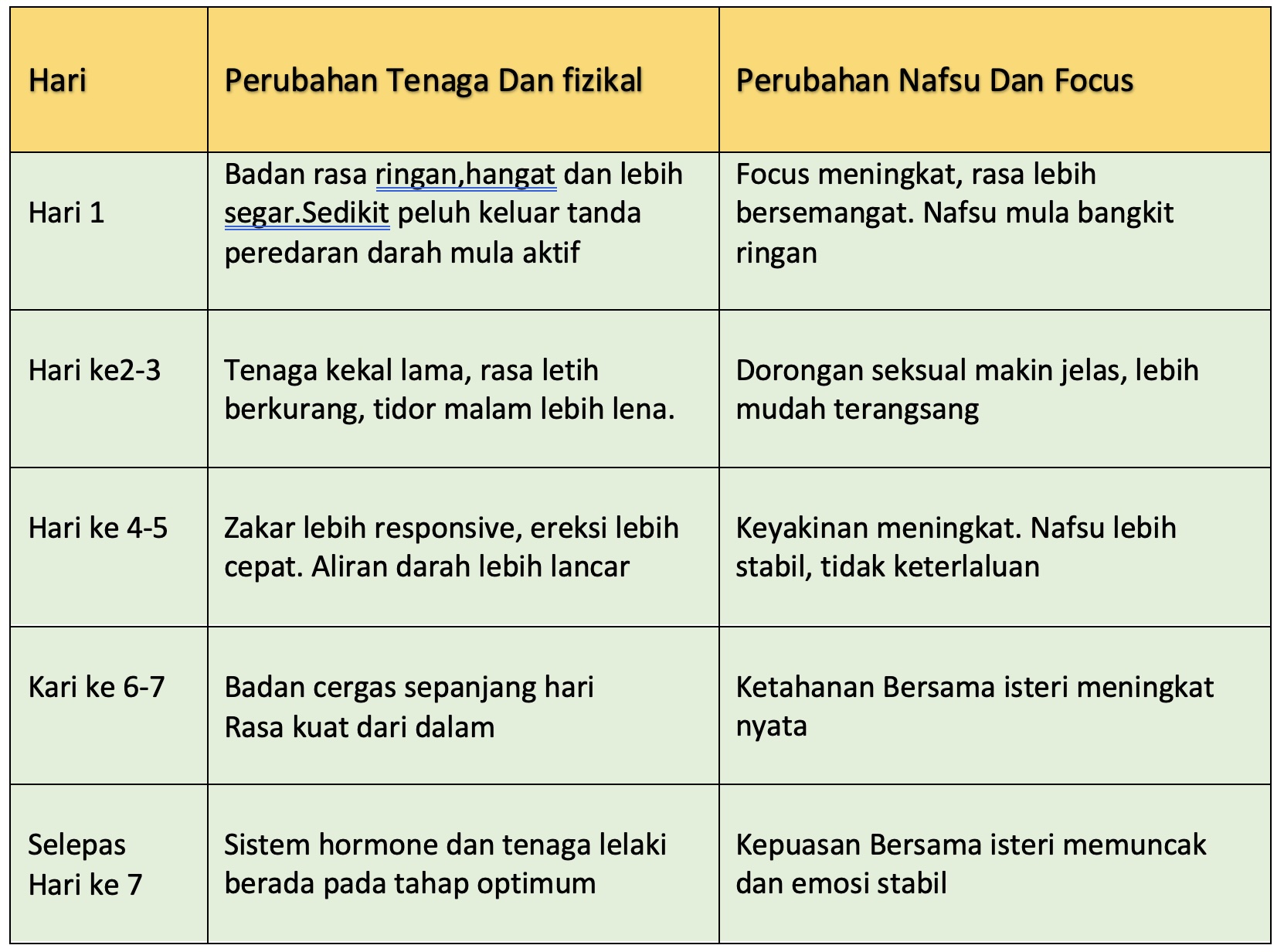 Dalam masa 7 hari dengan penggunaan yang betul dan disiplin anda sudah mula merasai perubahan yang ketara. Kecergasan badan meningkat, fikiran yang lebih tenang dan kualiti seks yang nemuaskan. Sayangi diri anda kerana ia tanggungjawab anda.